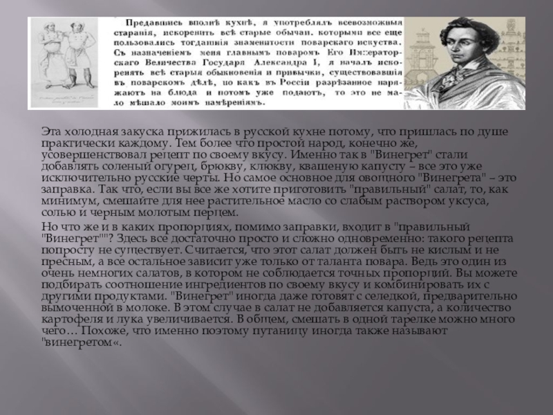 душе практически каждому. Тем более что простой народ, конечно же, усовершенствовал рецепт по своему вкусу. Именно так в "Винегрет" стали добавлять соленый огурец, брюкву, клюкву, квашеную капусту – все это уже исключительно русские черты. Но самое основное для овощного "Винегрета" – это заправка. Так что, если вы все же хотите приготовить "правильный" салат, то, как минимум, смешайте для нее растительное масло со слабым раствором уксуса, солью и черным молотым перцем.