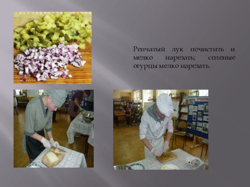 Слайд 19Репчатый лук почистить и мелко нарезать; соленые огурцы мелко нарезать.