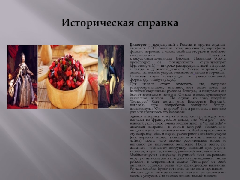 Для начала стоит отметить, что, вопреки распространенному мнению, этот салат вовсе не является старинным русским блюдом, и придуман он был относительно недавно. Однако и здесь существует несколько версий… По одной из них, впервые "Винегрет" был подан еще Екатерине Великой, которая, едва попробовав холодное блюдо, воскликнула: "Фи, не грето!" Так и родилось, а позднее уже и закрепилось его название.