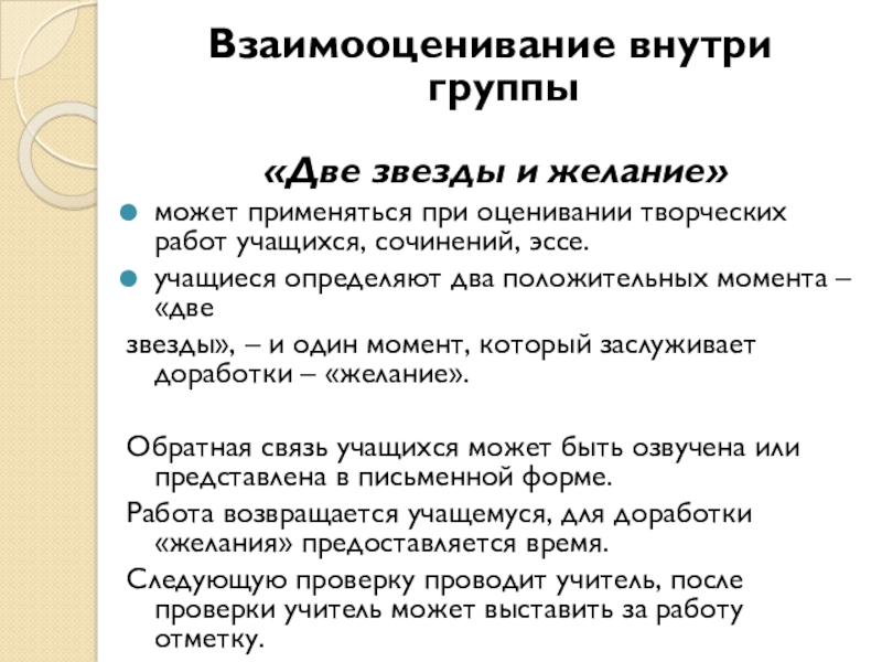 Взаимооценивание внутри группы «Две звезды и желание»может применяться при оценивании творческих работ учащихся, сочинений, эссе.учащиеся определяют два