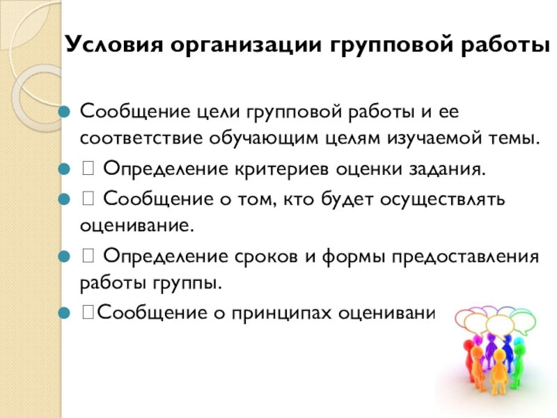 Условия организации групповой работыСообщение цели групповой работы и ее соответствие обучающим целям изучаемой темы.ƒ Определение критериев оценки