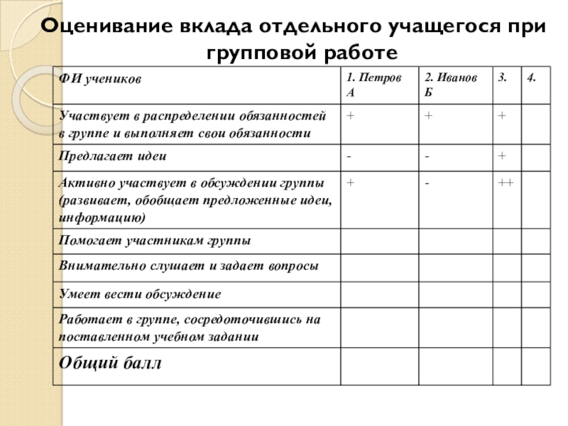 Слайд 6Оценивание вклада отдельного учащегося при групповой работе
