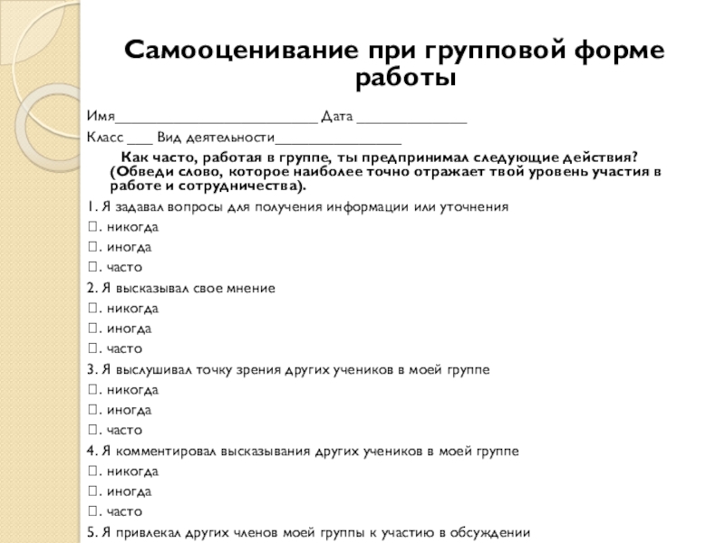 Самооценивание при групповой форме работыИмя________________________ Дата _____________Класс ___ Вид деятельности_______________    Как часто, работая в