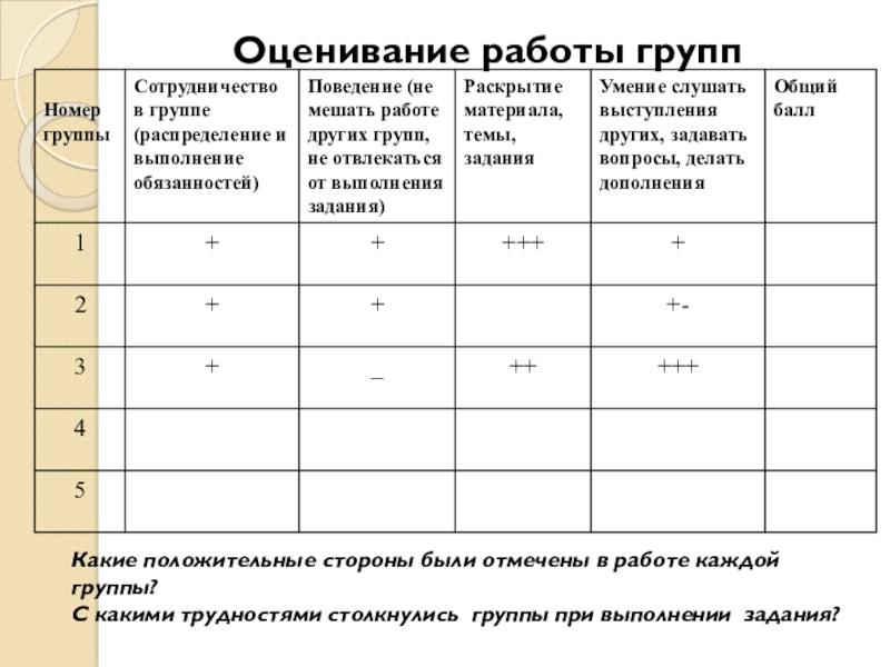 Оценивание работы группКакие положительные стороны были отмечены в работе каждой группы?С какими трудностями столкнулись группы при выполнении