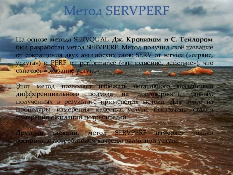 разработан метод SERVPERF. Метод получил своё название от сокращения двух английских слов: SERV от service («сервис, услуга») и PERF от performance («выполнение, действие»), что означает «оказание услуги».
