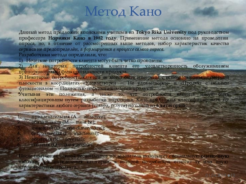 руководством профессора Норияки Кано в 1982 году. Применение метода основано на проведении опроса, но, в отличие от рассмотренных выше методов, набор характеристик качества сервиса не предопределён, а формируется в процессе самого опроса.