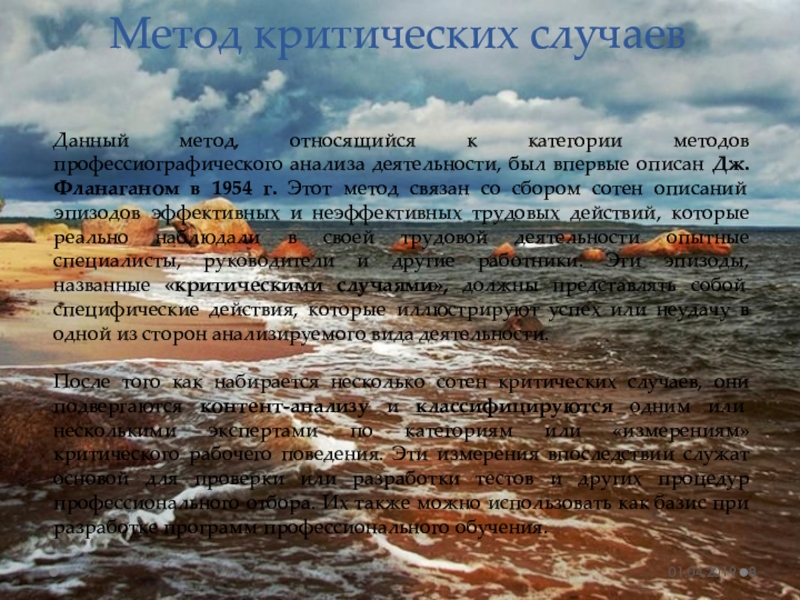был впервые описан Дж. Фланаганом в 1954 г. Этот метод связан со сбором сотен описаний эпизодов эффективных и неэффективных трудовых действий, которые реально наблюдали в своей трудовой деятельности опытные специалисты, руководители и другие работники. Эти эпизоды, названные «критическими случаями», должны представлять собой специфические действия, которые иллюстрируют успех или неудачу в одной из сторон анализируемого вида деятельности.