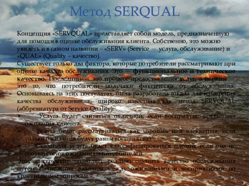 Существует только два фактора, которые потребители рассматривают при оценке качества обслуживания. Это — функциональное и техническое качество. Последний — это процесс предоставления услуг, а первый — это то, что потребители получают фактически от обслуживания. Основываясь на этих постулатах, была разработана шкала для измерения качества обслуживания, широко известная как метод SERVQUAL (аббревиатура от Service Quality):