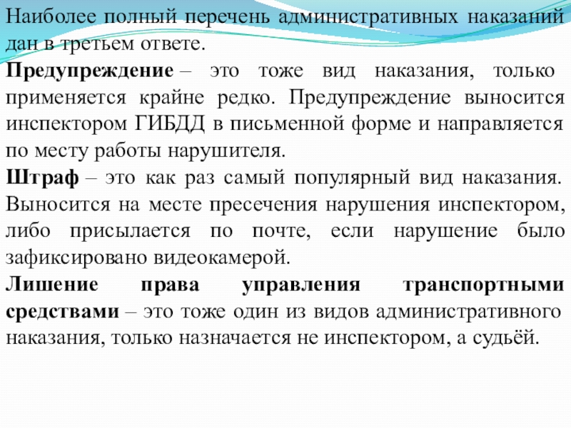 Слайд 13Наиболее полный перечень административных наказаний дан в третьем ответе.