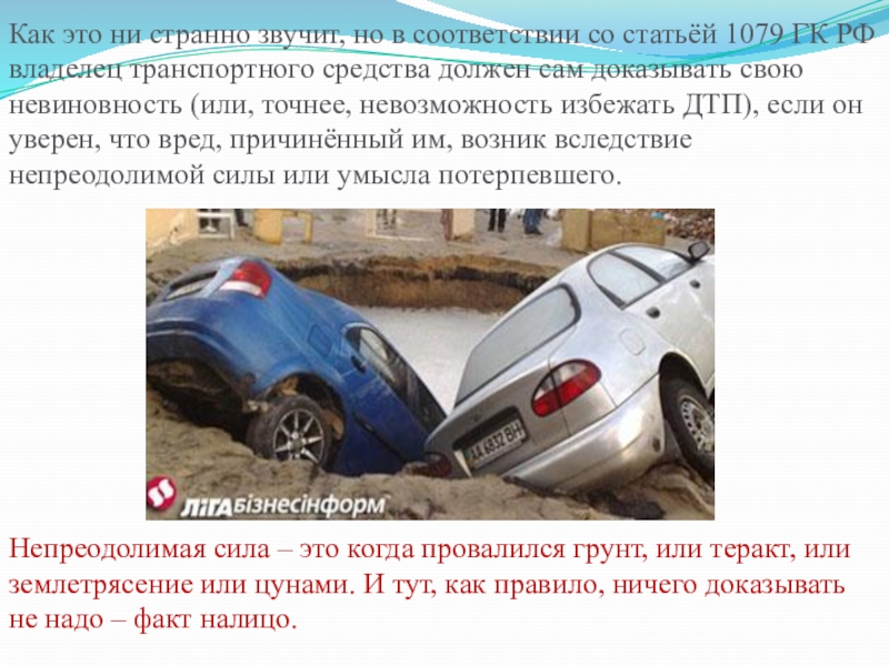 ГК РФ владелец транспортного средства должен сам доказывать свою невиновность (или, точнее, невозможность избежать ДТП), если он уверен, что вред, причинённый им, возник вследствие непреодолимой силы или умысла потерпевшего.