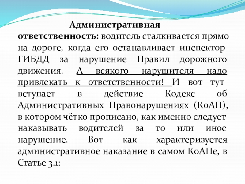 ГИБДД за нарушение Правил дорожного движения. А всякого нарушителя надо привлекать к ответственности! И вот тут вступает в действие Кодекс об Административных Правонарушениях (КоАП), в котором чётко прописано, как именно следует наказывать водителей за то или иное нарушение. Вот как характеризуется административное наказание в самом КоАПе, в Статье 3.1: