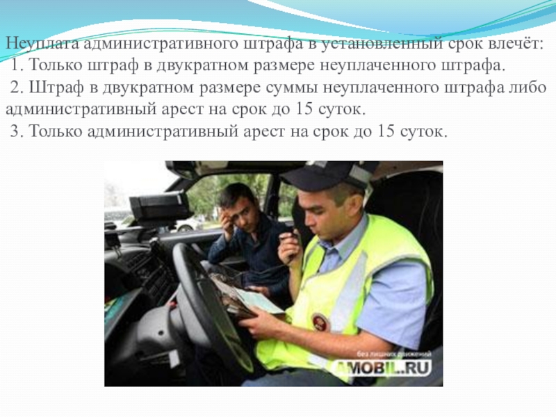 Слайд 15Неуплата административного штрафа в установленный срок влечёт: