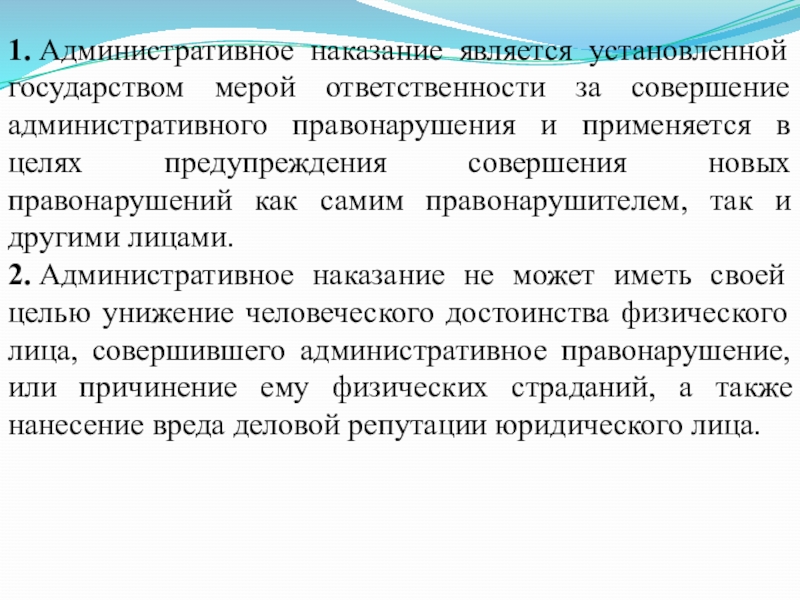 2. Административное наказание не может иметь своей целью унижение человеческого достоинства физического лица, совершившего административное правонарушение, или причинение ему физических страданий, а также нанесение вреда деловой репутации юридического лица.