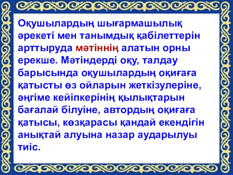 Слайд 15Оқушылардың шығармашылық әрекеті мен танымдық қабілеттерін арттыруда мәтіннің алатын орны ерекше.