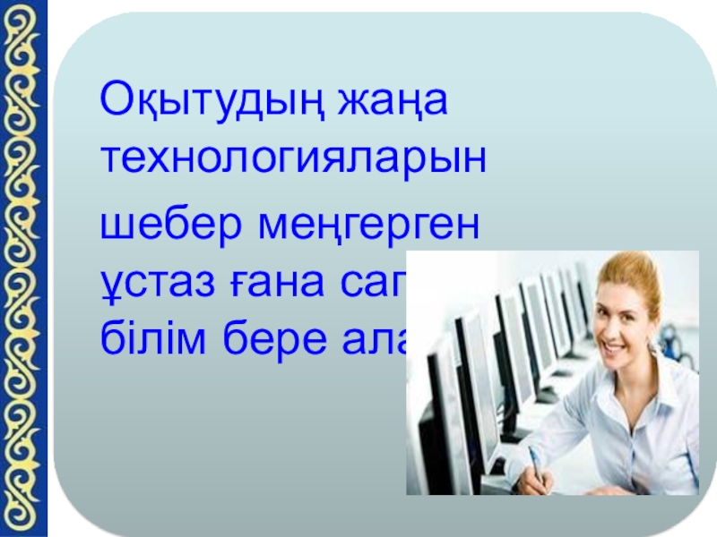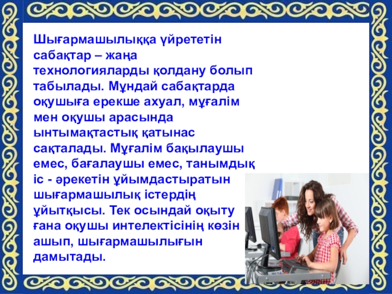 Слайд 12Шығармашылыққа үйрететін сабақтар – жаңа технологияларды қолдану болып табылады. Мұндай сабақтарда