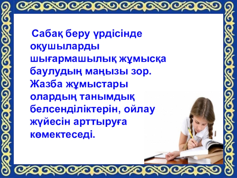 Слайд 13 Сабақ беру үрдісінде оқушыларды шығармашылық жұмысқа баулудың маңызы зор. Жазба