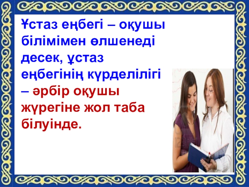 Слайд 20Ұстаз еңбегі – оқушы білімімен өлшенеді десек, ұстаз еңбегінің күрделілігі –