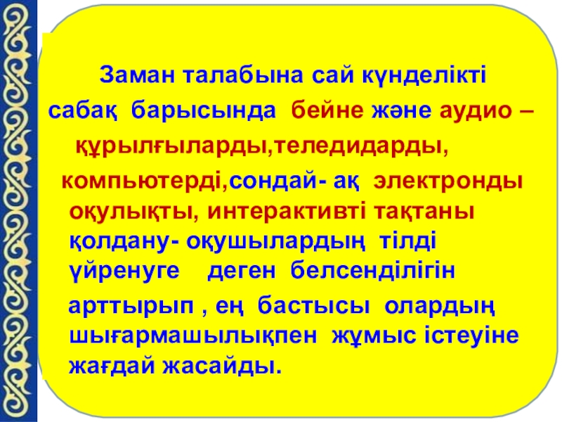 компьютерді,сондай- ақ электронды оқулықты, интерактивті тақтаны қолдану- оқушылардың тілді үйренуге деген белсенділігін