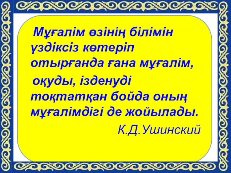 Мұғалім өзінің білімін үздіксіз көтеріп отырғанда ғана мұғалім, оқуды, ізденуді тоқтатысымен оның мұғалімдігі де жойылады.