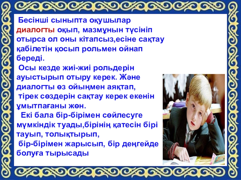 Слайд 16 Бесінші сыныпта оқушылар диалогты оқып, мазмұнын түсініп отырса ол оны