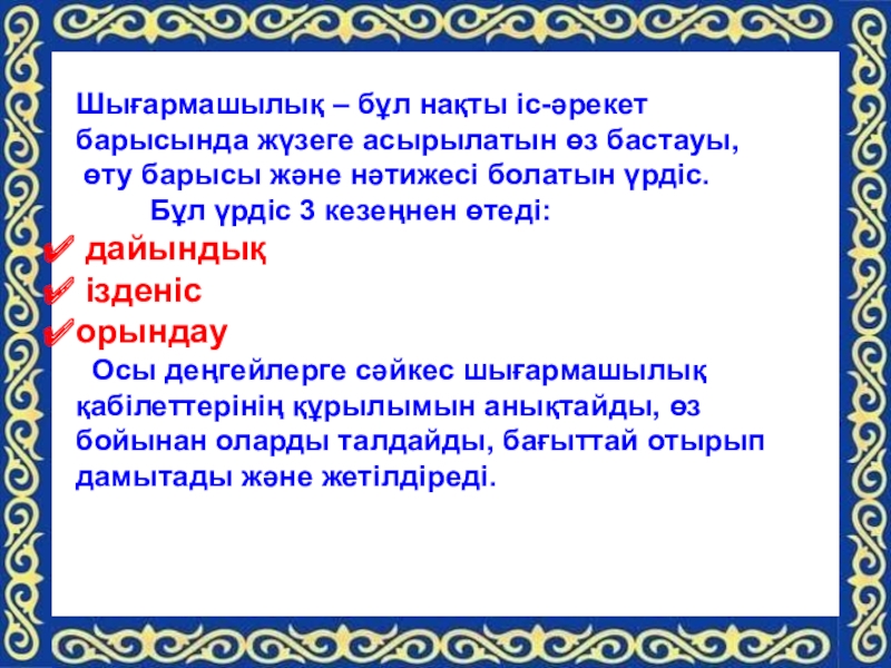 Слайд 11Шығармашылық – бұл нақты іс-әрекет барысында жүзеге асырылатын өз бастауы,
