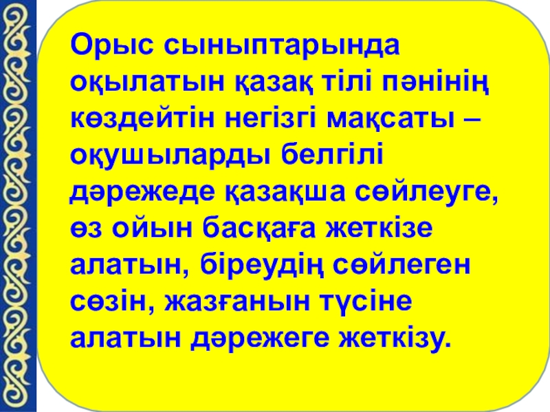 Орыс сыныптарында оқылатын қазақ тілі пәнінің көздейтін негізгі мақсаты – оқушыларды