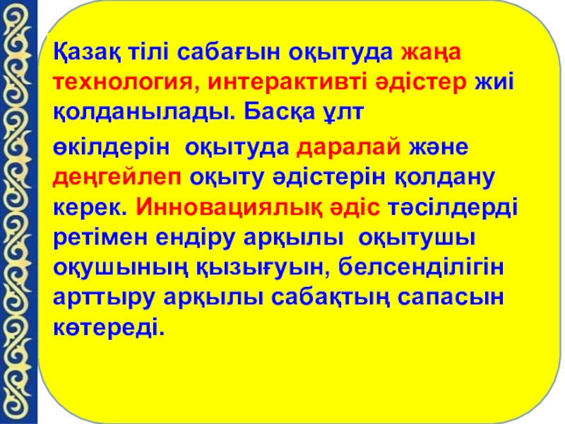 Қазақ тілі сабағын оқытуда жаңа технология, интерактивті әдістер жиі қолданылады. Басқа