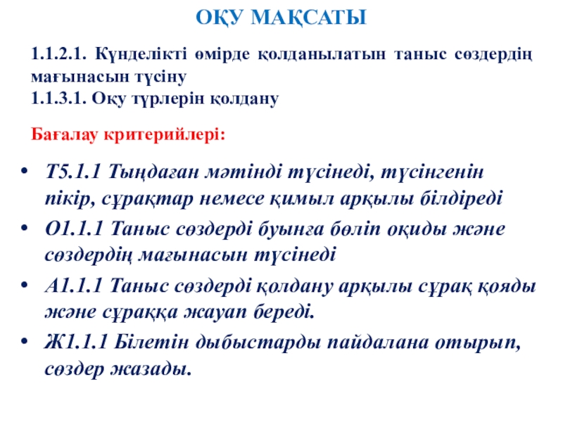 О1.1.1 Таныс сөздерді буынға бөліп оқиды және сөздердің мағынасын түсінеді