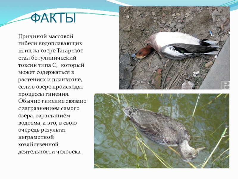 токсин типа С, который может содержаться в растениях и планктоне, если в озере происходят процессы гниения. Обычно гниение связано с загрязнением самого озера, зарастанием водоема, а это, в свою очередь результат неграмотной хозяйственной деятельности человека.