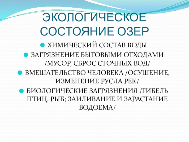 Слайд 8ЭКОЛОГИЧЕСКОЕ СОСТОЯНИЕ ОЗЕР