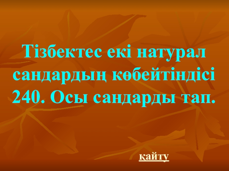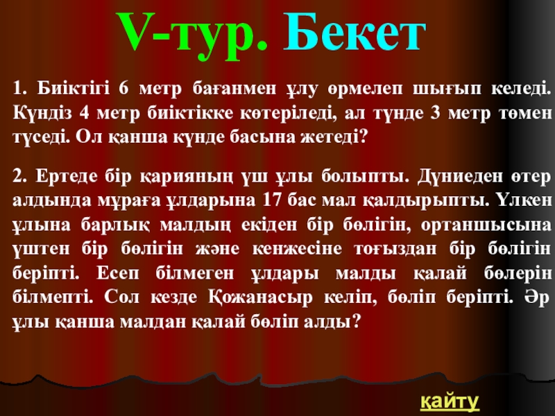 1. Биіктігі 6 метр бағанмен ұлу өрмелеп шығып келеді. Күндіз 4 метр биіктікке көтеріледі, ал түнде 3 метр төмен түседі. Ол қанша күнде басына жетеді?