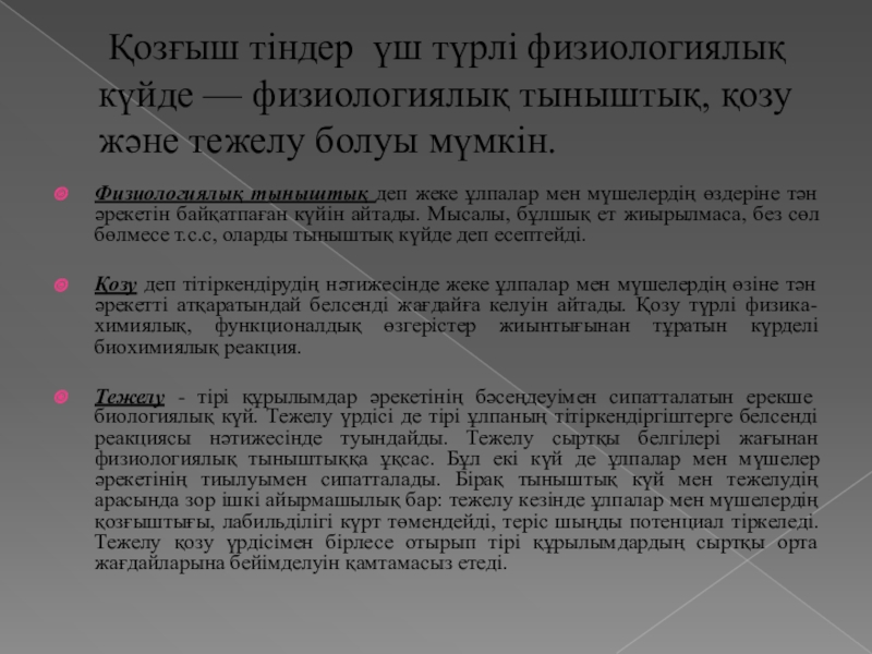 Физиологиялық тыныштық деп жеке ұлпалар мен мүшелердің өздеріне тән әрекетін байқатпаған күйін айтады. Мысалы, бұлшық ет жиырылмаса, без сөл бөлмесе т.с.с, оларды тыныштық күйде деп есептейді.