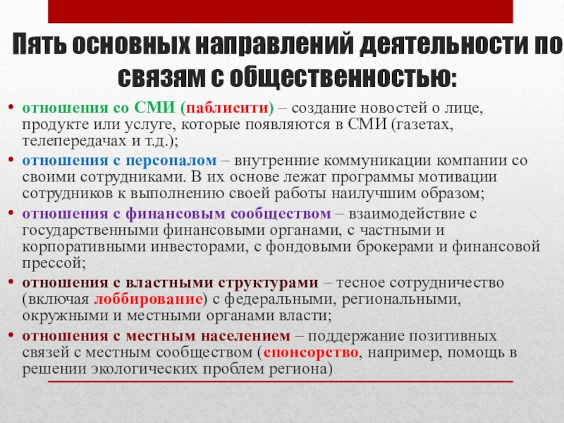 Слайд 10Пять основных направлений деятельности по связям с общественностью: