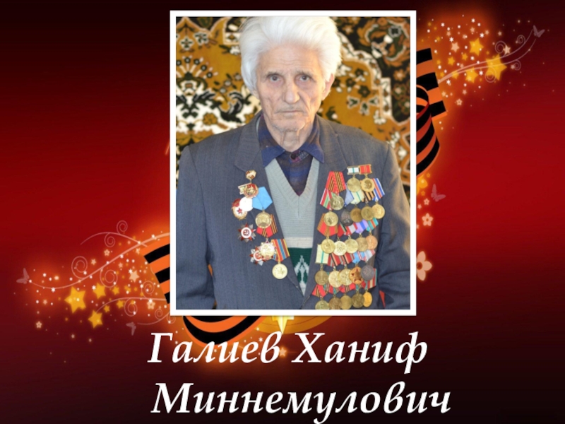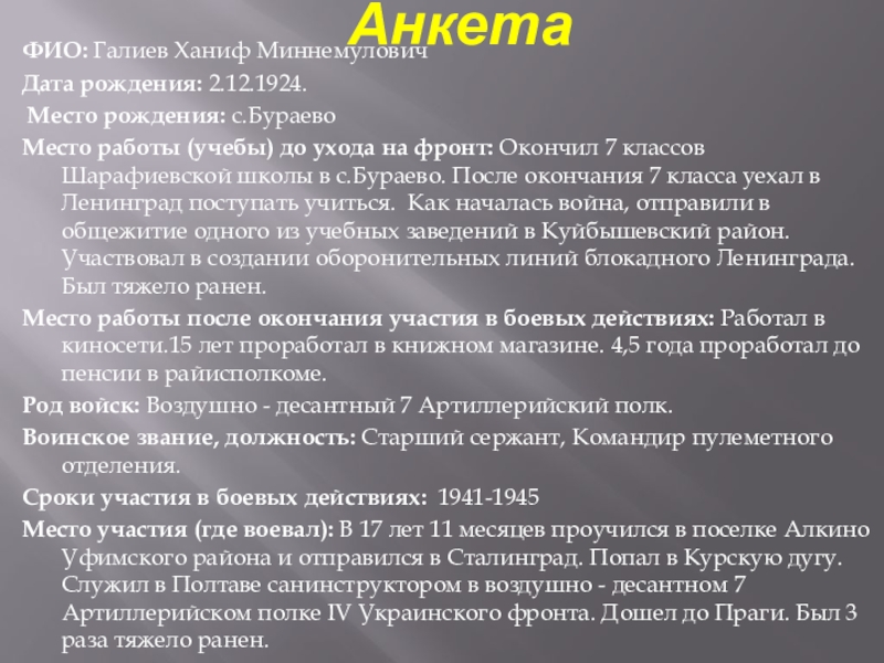 Анкета ФИО: Галиев Ханиф Миннемулович Дата рождения: 2.12.1924.   Место рождения: с.БураевоМесто работы (учебы) до ухода