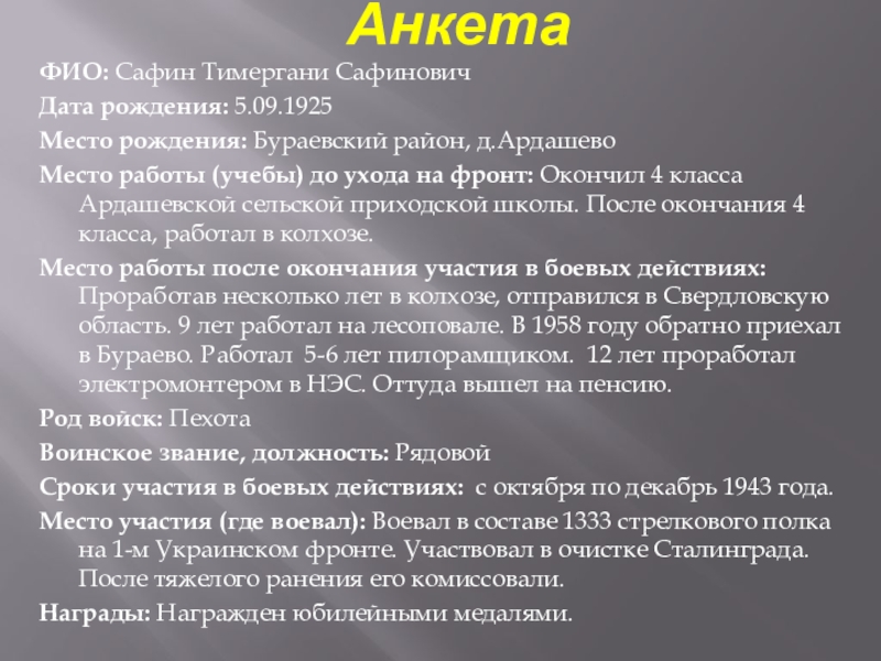 Анкета ФИО: Сафин Тимергани Сафинович Дата рождения: 5.09.1925 Место рождения: Бураевский район, д.Ардашево Место работы (учебы) до