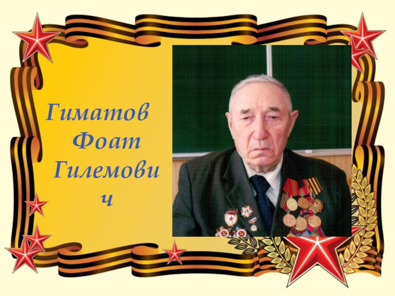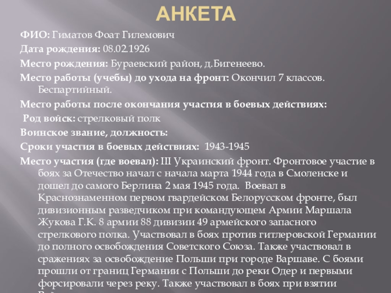 АНКЕТАФИО: Гиматов Фоат ГилемовичДата рождения: 08.02.1926 Место рождения: Бураевский район, д.Бигенеево.Место работы (учебы) до ухода на фронт: