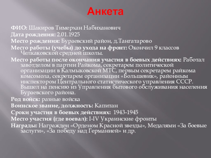 АнкетаФИО: Шакиров Тимерхан НабихановичДата рождения: 2.01.1925 Место рождения: Бураевский район, д.ТангатаровоМесто работы (учебы) до ухода на фронт:
