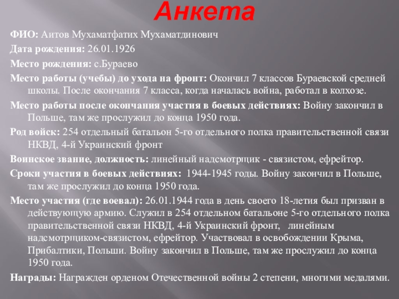 Анкета ФИО: Аитов Мухаматфатих Мухаматдинович Дата рождения: 26.01.1926Место рождения: с.БураевоМесто работы (учебы) до ухода на фронт: Окончил
