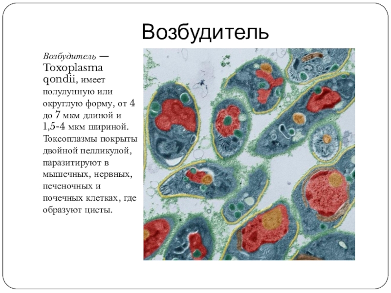 Возбудитель — Toxoplasma qondii, имеет полулунную или округлую форму, от 4 до