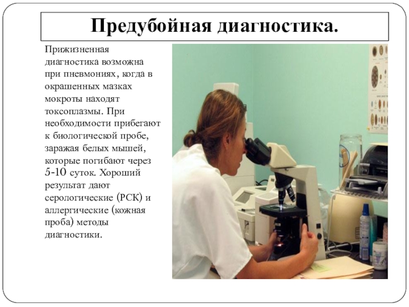 находят токсоплазмы. При необходимости прибегают к биологической пробе, заражая белых мышей, которые погибают через 5-10 суток. Хороший результат дают серологические (РСК) и аллергические (кожная проба) методы диагностики.