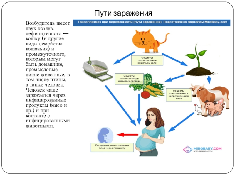 семейства кошачьих) и промежуточного, которым могут быть домашние, промысловые, дикие животные, в том числе птицы, а также человек. Человек чаще заражается через инфицированные продукты (мясо и др.) и при контакте с инфицированными животными.