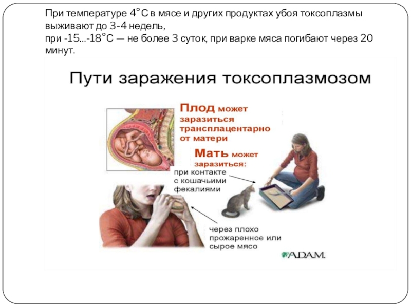 Слайд 7При температуре 4°С в мясе и других продуктах убоя токсоплазмы выживают
