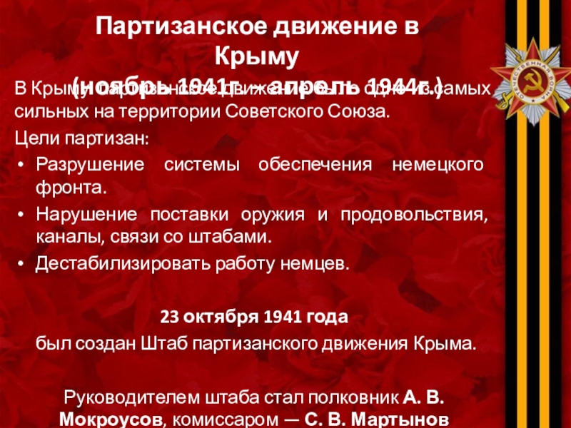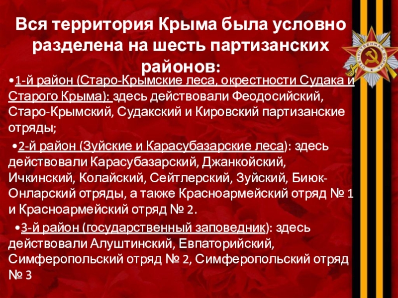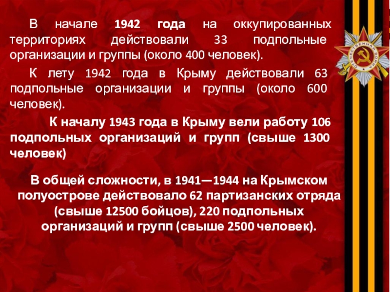 В общей сложности, в 1941—1944 на Крымском полуострове действовало 62 партизанских отряда (свыше 12500 бойцов), 220 подпольных организаций и групп (свыше 2500 человек).