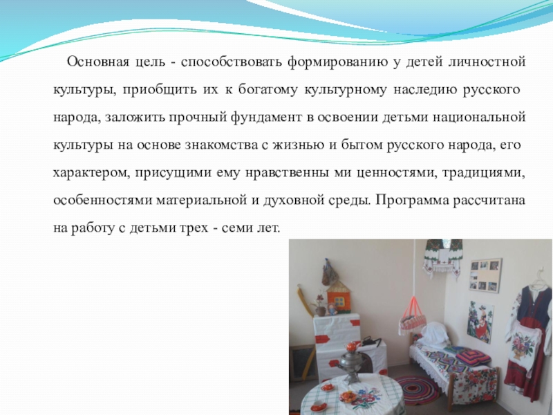 к богатому культурному наследию русского народа, заложить прочный фундамент в освоении детьми национальной культуры на основе знакомства с жизнью и бытом русского народа, его характером, присущими ему нравственны ми ценностями, традициями, особенностями материальной и духовной среды. Программа рассчитана на работу с детьми трех - семи лет.