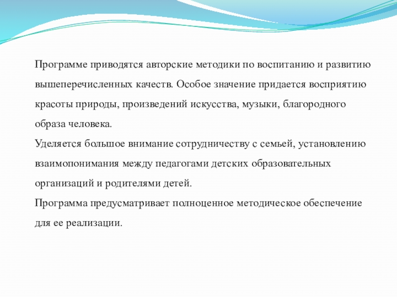 значение придается восприятию красоты природы, произведений искусства, музыки, благородного образа человека. Уделяется большое внимание сотрудничеству с семьей, установлению взаимопонимания между педагогами детских образовательных организаций и родителями детей. Программа предусматривает полноценное методическое обеспечение для ее реализации.