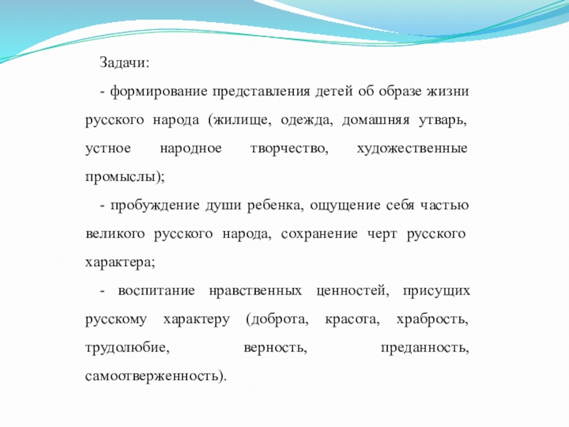 Задачи:- формирование представления детей об образе жизни русского народа (жилище, одежда, домашняя утварь, устное народное творчество, художественные