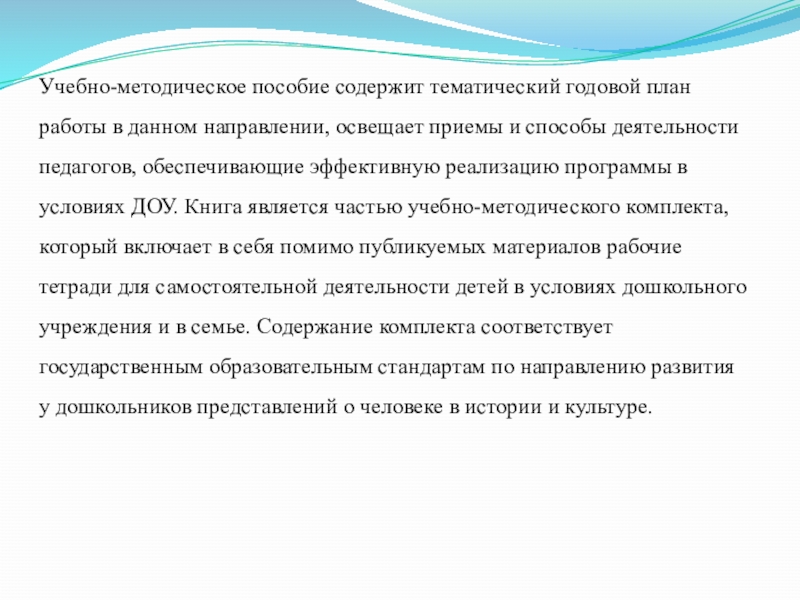 Слайд 11Учебно-методическое пособие содержит тематический годовой план работы в данном направлении, освещает