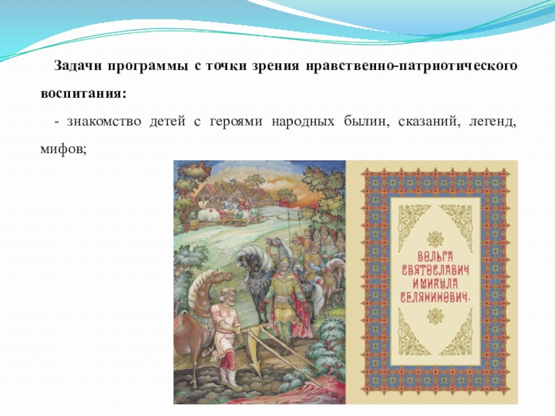 Задачи программы с точки зрения нравственно-патриотического воспитания:- знакомство детей с героями народных былин, сказаний, легенд, мифов;