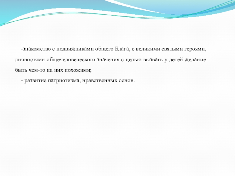 -знакомство с подвижниками общего Блага, с великими святыми героями, личностями общечеловеческого значения с целью вызвать у детей