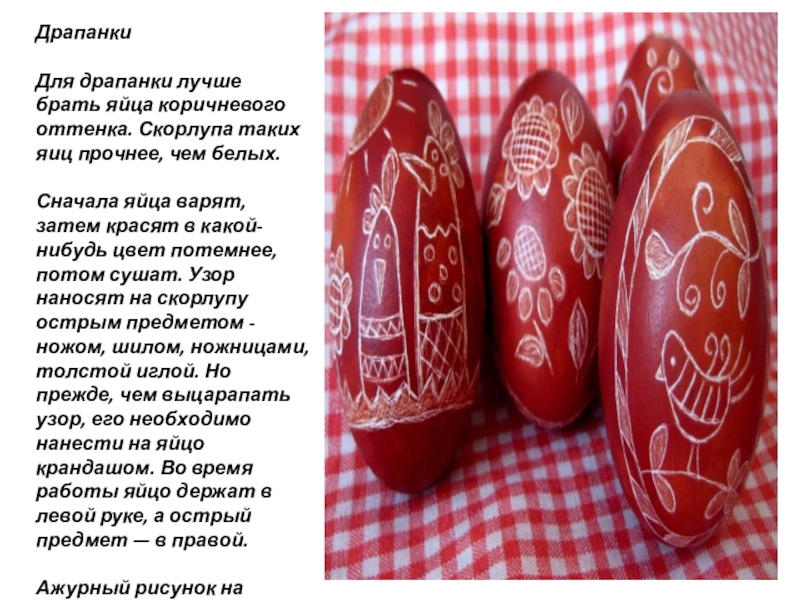 Для драпанки лучше брать яйца коричневого оттенка. Скорлупа таких яиц прочнее,